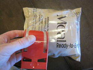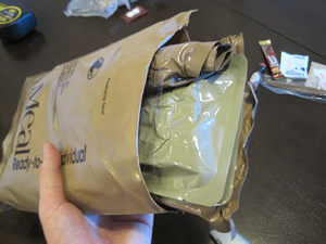 Warning! Before you field strip your MRE, you should check with your overhead about whether or not it's alright to do this. Some crews allow it, others don't. By opening the bag, you're breaking the seal, and voiding the expiration date on the MRE. Since the MRE is government property,you'd better listen to your Captain. Given the volume of MREs that hotshot crews eat, it shouldn't be an issue. Still, check with your supervisor first.
