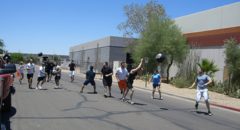 Now, this father of two spends his days putting his clients through some of the most arduous and unconventional workouts around. On any given day in Tempe, Arizona his members are climbing ropes, lifting tractor tires, swinging sledge hammers, tossing medicine balls, holding half filled beer kegs above their heads, and running 400m repeats till they can't see straight.