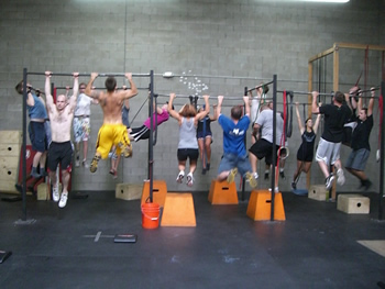 There are people who have done nothing but CrossFit and then gone out and run marathons, or done triathlons, but there’s no substitute for specific training. What this can do is get rid of some of the conditioning, and some of the weaknesses. A lot of what we do is try to shore up some of the weaknesses that you have. Most people tend to be weak in the posterior kinetic chain (hamstrings, glutes, back, the pulling muscles). The things that you can’t see in the mirror. I mean, how often do you see deadlifts at 24 Hour Fitness? Or Kettle bells? A lot of the things that we do are things that cause people a lot of pain in the beginning because they’re just not used to working those muscles in their traditional workout routines. We do a lot of large scale movements like picking things up and carrying things around, and squatting things and pushing things, and pulling ourselves and other things versus isolation movements.