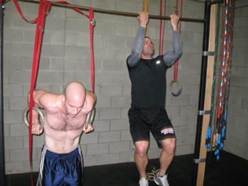 KU: It really depends on budget. There’s people out there who have done it with spending next to nothing. They go on Craigslist and get a bar, go to Play it Again Sports, and get some weights, or use cinder blocks for weights. You can get a relatively decent set of plates and a bar for $200-300. The Olympic Rings are nice, because you can do pull-ups, and pulling-type exercises. If you don’t have a place for a pull-up bar, you can sling them over a truss or a tree limb. You can make the rings that we use fairly easily as well. Just get some PVC pipe, fill it with sand and heat it, and beat it into shape. (for more info on building your own Olympic Rings, check out this youtube video.)