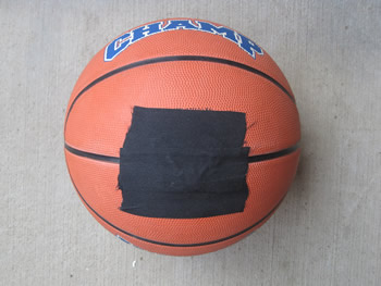 After some thought I decided to tape over the puncture to give it some added protection. I had some black athletic tape lying around the house, so I just took that out and threw a few overlapping strips over the hole. I considered wrapping the entire ball in tape, and just thought that might be overkill. We'll see how this holds up.