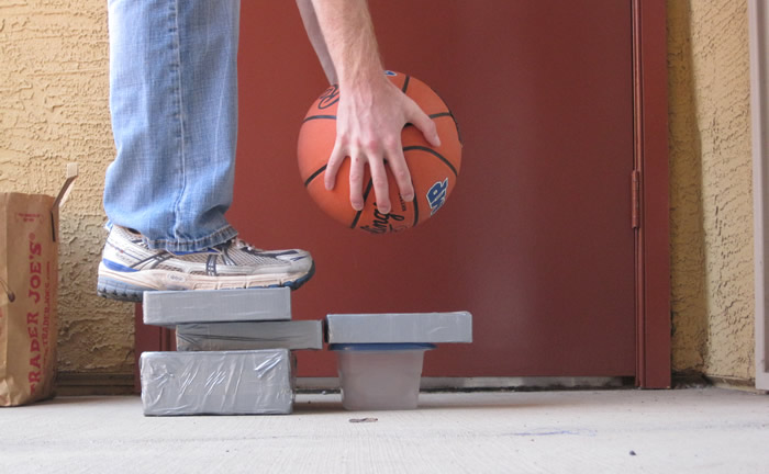 Lacking a rubber mallet, or anything even remotely close to that, we looked around at options. The best we had was our home-made medicine ball. It was going to have to do. We raised the medicine ball to about mid-thigh, closed our eyes, scrunched up our toes and dropped it. And much to our surpirse, it split pretty damn clean! A little jagged, but after both halves were wrapped in tape - it wasn't even noticeable.