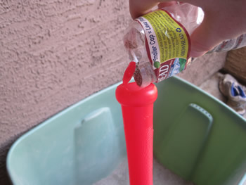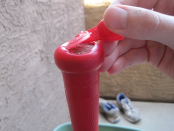 The process is fairly straight forward. We decided to make our insertion point at the base of the bat's handle.We just carved out a half-moon shaped flap, peeled it back and called it good. There was enough room to use the funnel, but we decided to skip it and just scoop the sand in directly.